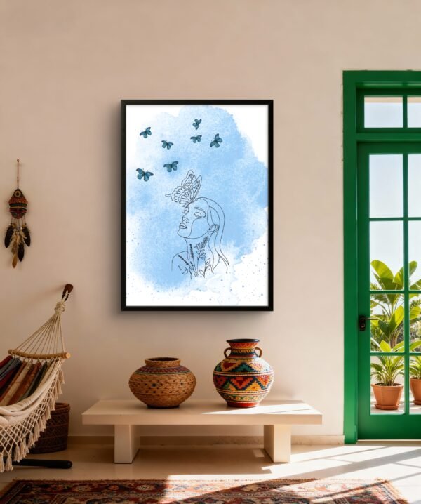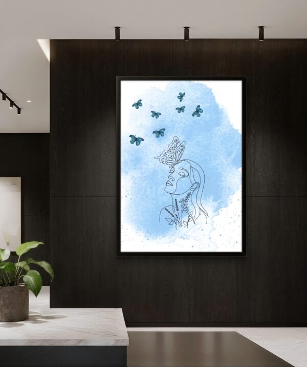 Capture the color of a dream. This ethereal artwork, Celestial Daydream, blends a linear female portrait with the delicate magic of a butterfly, all rendered in soothing shades of blue. It feels like a frozen moment of imagination and tranquility, inviting you to embrace your own daydreams and the quiet wisdom they hold. A whimsical and calming addition to any creative space or bedroom.
