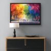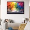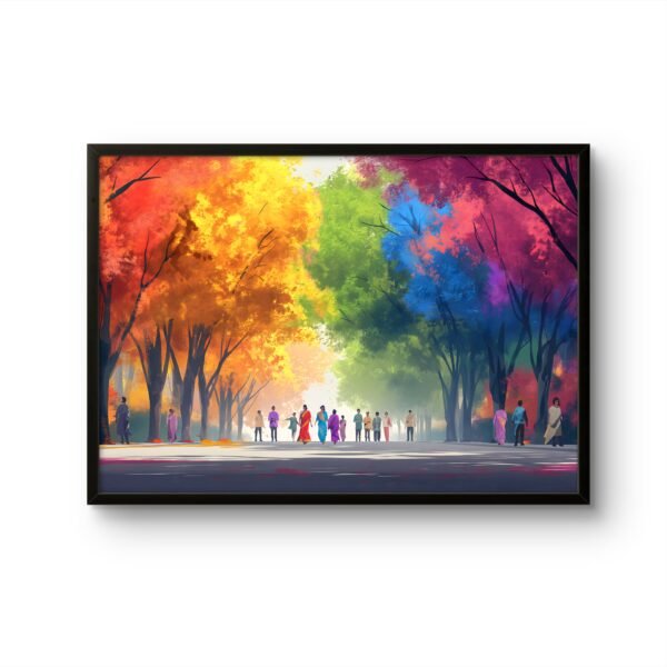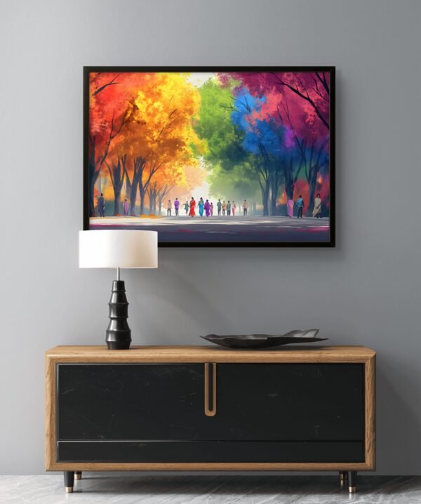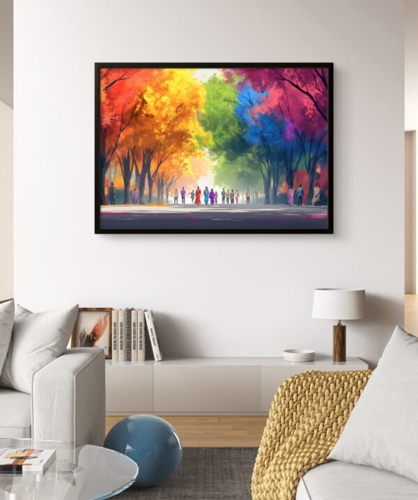 Step into a world of magical realism. ‘The Chromatic Canopy’ is a fantastical scene where a majestic tree, with leaves of pure, glowing color, stands as a beacon in the landscape. Tiny, silhouetted figures walk along a path dappled with its radiant light, suggesting a journey filled with wonder and guided by natural magic. This piece is a celebration of imagination and the extraordinary beauty that can be found just beyond the edges of the ordinary.
