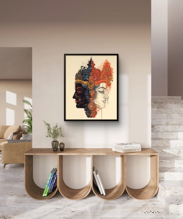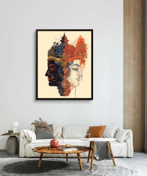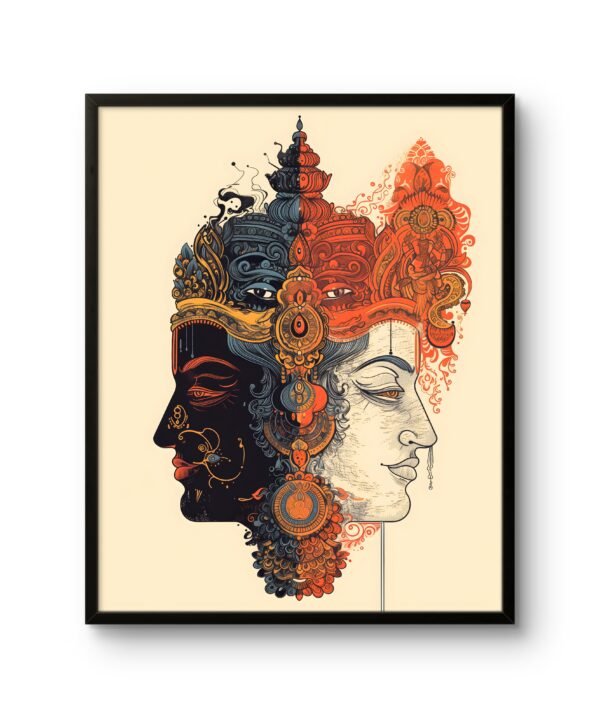 Embrace the universe within. The Cosmic Duality art print visually merges two archetypal faces one of the radiant Sun and one of the serene Moon into a single, harmonious deity. This piece explores the divine balance of opposing forces: light and dark, action and intuition, masculine and feminine. It invites deep contemplation on the nature of wholeness, making it a captivating center piece for a meditation space, studio, or any environment dedicated to spiritual exploration and personal growth.