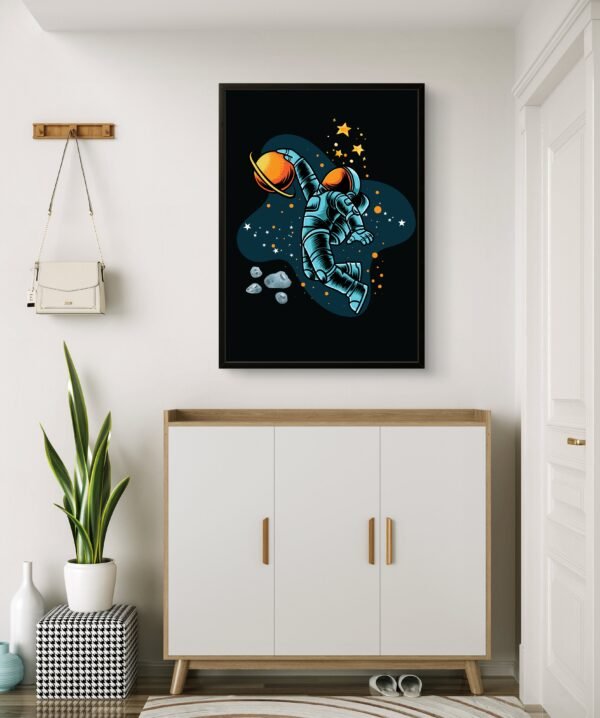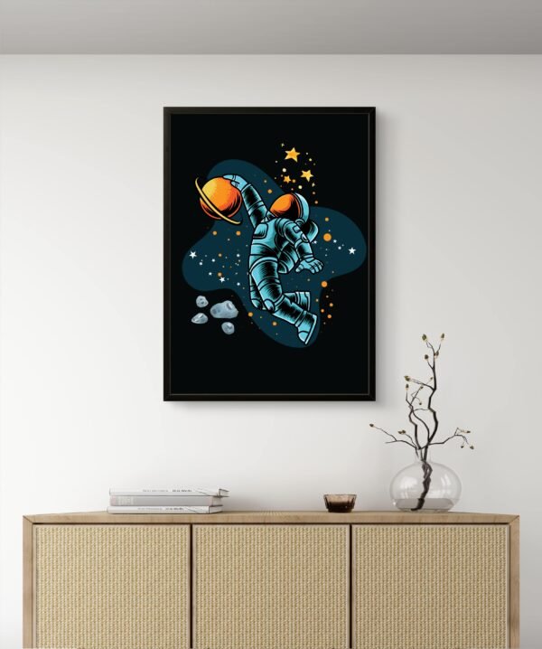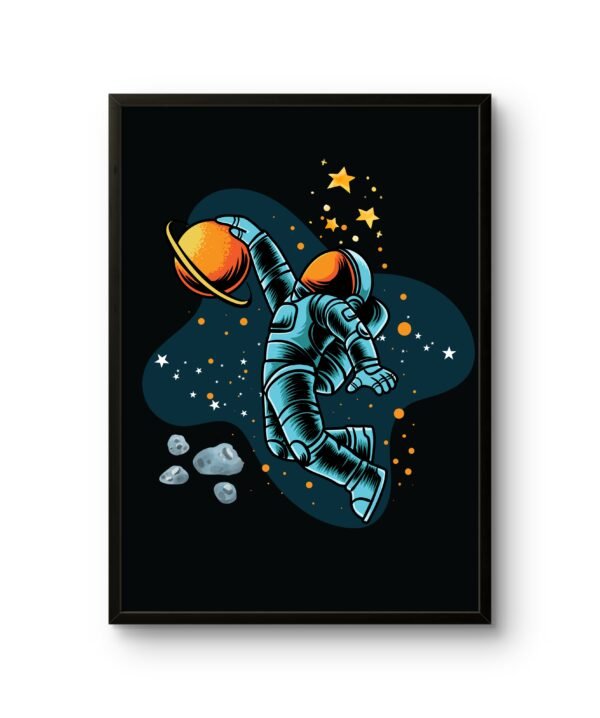 Where intergalactic sports and playful dreams collide. This whimsical artwork, Cosmic Game Night, reimagines the cosmos as the ultimate basketball court. Featuring an astronaut executing a perfect, joyful dunk on a smiling, cratered moon, it’s a tribute to never outgrowing your sense of wonder. This print adds a dose of fun and personality to any space, reminding you that imagination has no limits.