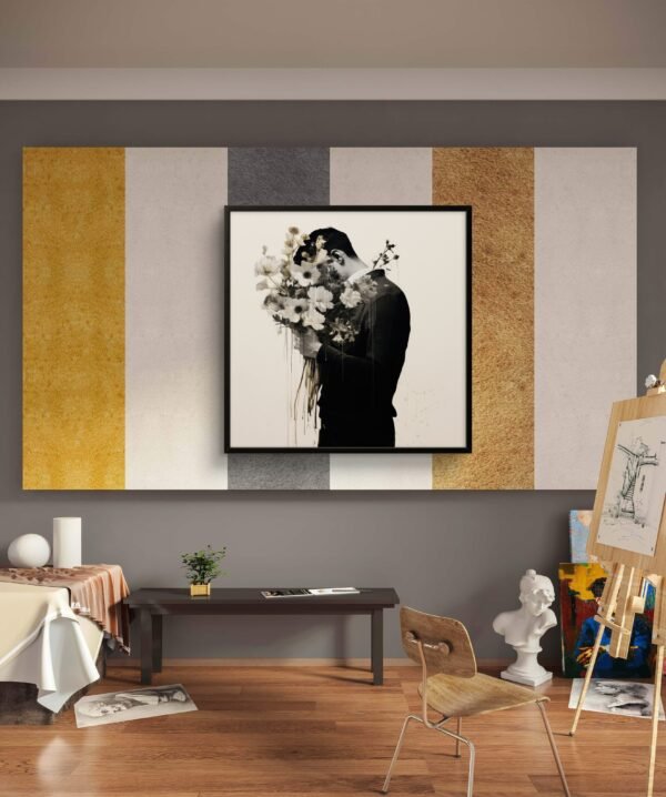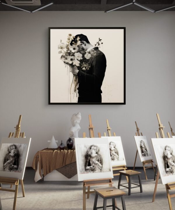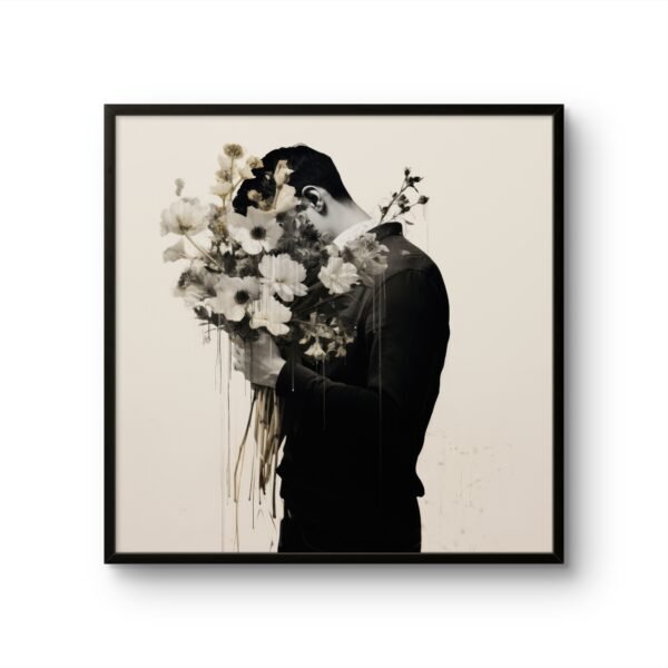 Man whose sharp, tailored suit is beautifully intertwined with lush, blooming flowers. This piece masterfully blends the structured lines of masculine fashion with the organic, flowing beauty of nature. It’s a visual representation of a new kind of strength one that is confident enough to embrace sensitivity, beauty, and depth.