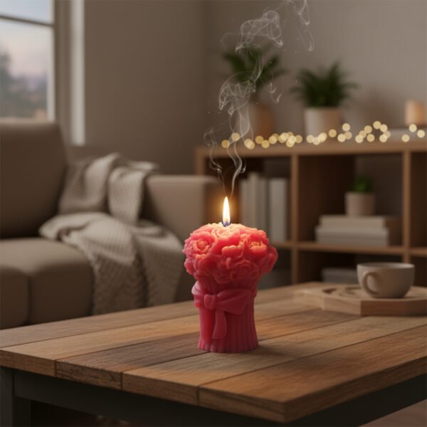 The Red Rose Bouquet Candle is hand-poured with premium paraffin wax and infused with a rich rose fragrance. Its vibrant red rose design adds a romantic, elegant touch to any space, making it perfect for décor, ambience, and gifting.